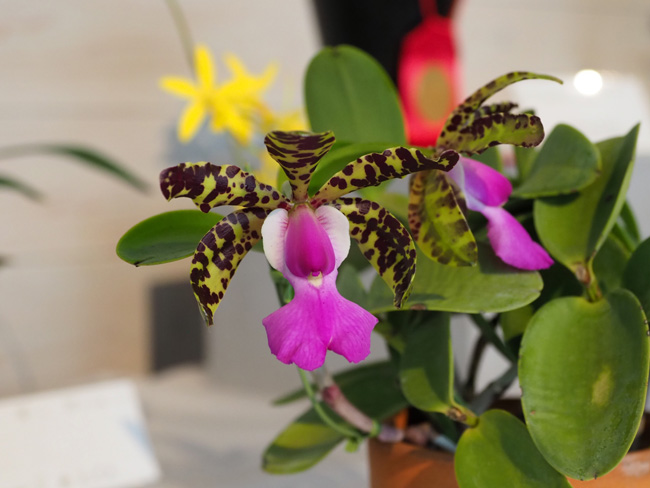 黒の斑点模様と、唇弁の紅紫色の鮮やかさ。花形の独特さによって、個性的な