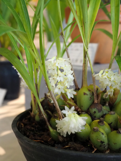 株元から立ち上げ短い花穂に白い小花を密に咲かせる。日本にはまだ