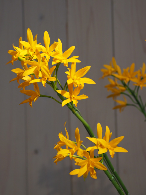 品種で、花茎も伸び、花数も多い豪華な品種である。本個体は濃黄色