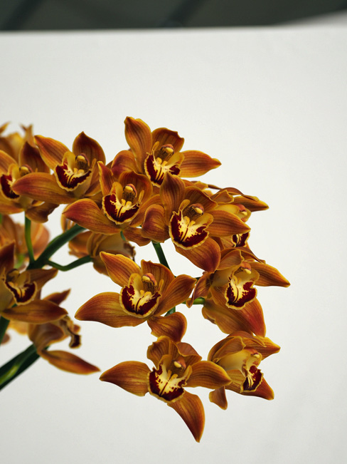 唇弁の黒褐色の縁取りがアクセントとなっている。花被片も動きが