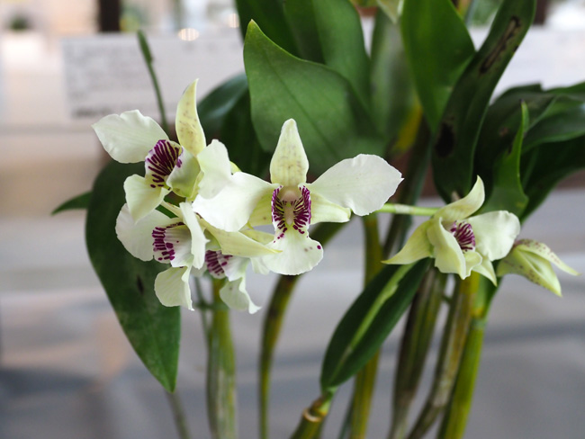 ている。横に幅のある花形。唇弁に独特の濃紫色の線模様。通常のデンドロビューム