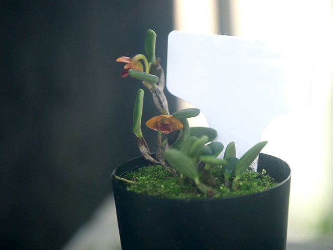 の仲間とは思えない。葉は多肉質で棒状で、花は黄褐色で、唇弁には濃い紅色が入る。