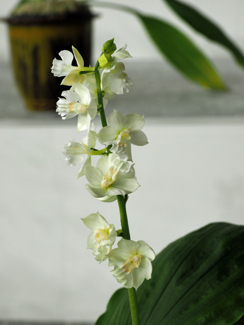 エビネの園芸品種の1つ。総白色の花色の品種で、花被片も幅広で