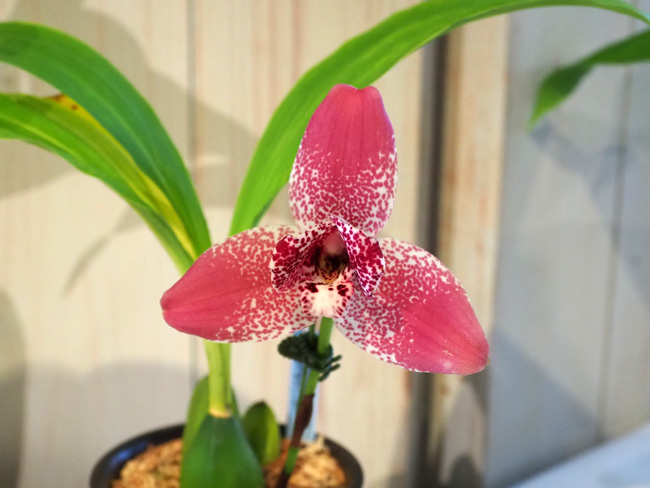 異なるものを感じる。紅紫色の花被片には白い斑点模様がグラデーションの