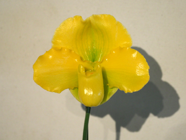 角の無い全体に丸い花形、平滑な花弁。強いつやに濁りの無い鮮やかな黄色の花色。
