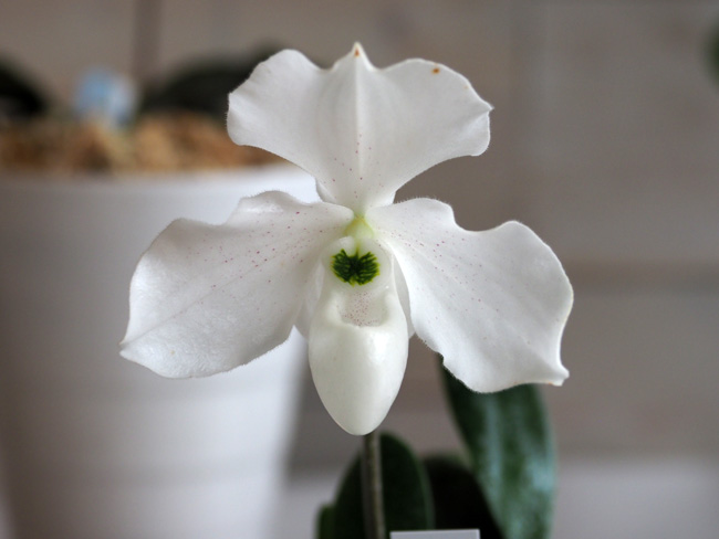 交配は( Paph. Astarte × Paph. niveum )。1922年の古典的な交配種だが、
