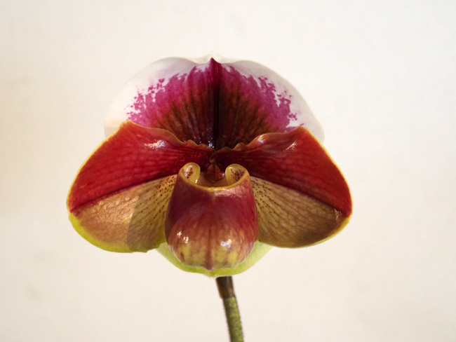 やや褐色がかった赤系の花色で、パフィオペディラムとしては目指す花色に向かって