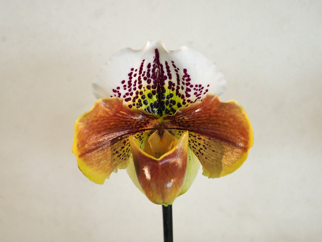 品種である。点花系の大輪整形花で、パフィオペディラムの典型的な花形と色彩の