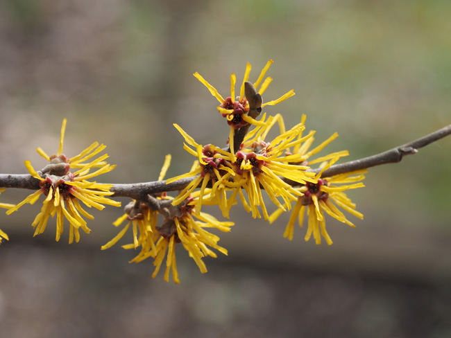 中国原産のマンサクの仲間の一種。花は日本のマンサクに似ているが、色が濃いのと